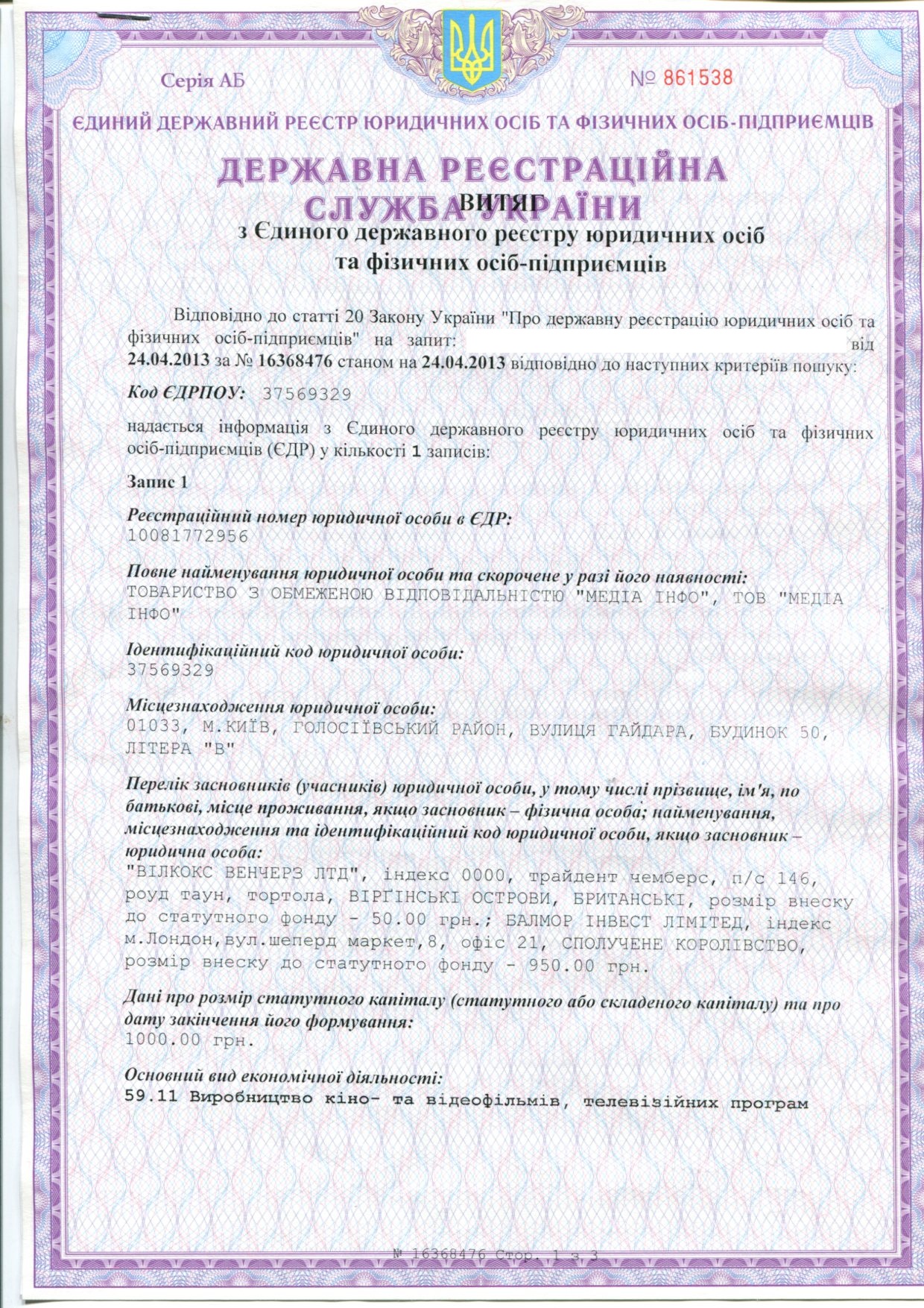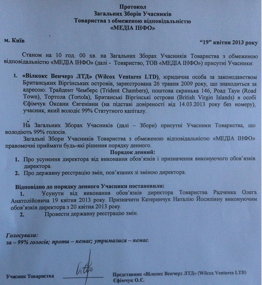На собрании участников Wilcox Ventures LTD представляла Оксана Ефимчук (на основании доверенности, выданной Wilcox Ventures LTD от 14.03.2013 г). Решением общего собрания акционеров директор «Медіа Інфо» Олег Радченко был отстранен от своих обязанностей, а новым директором назначена Наталья Катеринчук. На каких правовых основаниях компания (как оказалось), владеющая 5% уставного фонда смогла сменить директора, и как эти изменения прошли через госрегистратора - нам неизвестно.