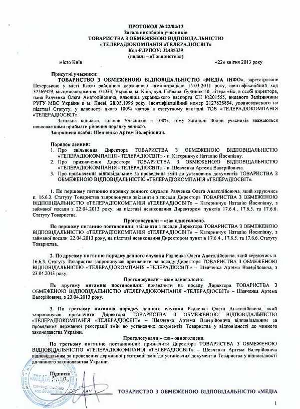 22 апреля на официальном сайте ТВі появилась информация, что новым генеральным директором телеканала стал Артем Шевченко, который сменил в руководстве Наталью Катеринчук. Также сообщалось, что новым инвестором канала, вместо Константина Кагаловского, стал американский бизнесмен Александр Альтман. Решение о смене директора было принято на собрании участников ТРК «ТелеРадіоСвіт», где интересы учредителей телеканала представлял экс-директор ООО «Медіа Інфо» Олег Радченко. Как видно на предыдущем скане, директором «Медіа Інфо» на тот момент уже была Наталья Катеринчук (назначенная решением общего сбора участников сомнительной легитимности). Наталья Катеринчук заявляет, что полномочий подписывать такой документ у Олега Радченко на тот момент уже не было.