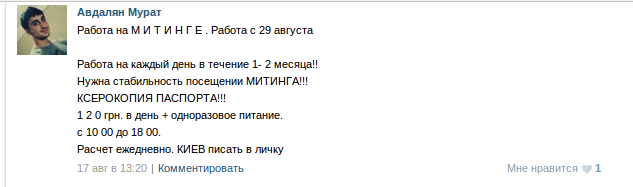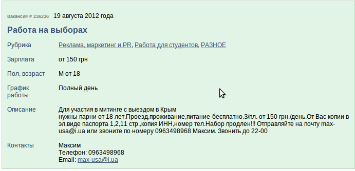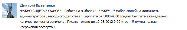 Осенью 2012 года в Украине состоятся парламентские выборы. Активные online-«вербовщики» массовки для участия в очередном фарсе, где высокими идеалами даже и не пахнет, обещают 120-160 грн. в день, непыльную работу, гибкий график. Взамен просят ксерокопию паспорта и ID-кода. Реально ли, не лоханувшись, снять бабла на главной политической склоке страны, в которой уже давно никто никому не верит?