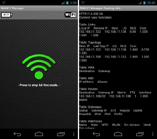 Подобная ячеистая сеть может стать востребованной в случае стихийного бедствия, если в округе пропадёт сотовая связь или исчезнет электричество. Запустив на своих смартфонах программу MANET Manager, пользователи получат возможность коммуникации, VoIP-телефонии и прочие работающие приложения, и даже смогут выйти в интернет, если хотя бы один узел ячеистой сети будет подключен к интернету.