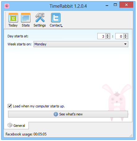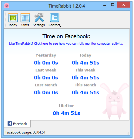 Для цього необхідно встановити на комп’ютер під управлінням Windows утиліту TimeRabbit. Програма відстежує реальну активність, а не лише наявність відкритих у браузері вкладок. Для цього вона контролює звернення до адреси facebook.com, на які відправляються інформаційні пакети. Після цього вона починає відлік часу використання соцмережі та додає його до загальної статистики.