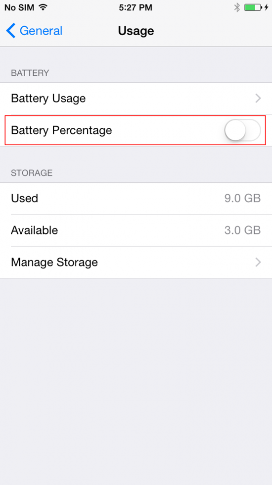 Там знайдіть пункт «Використання» (Usage) та увімкніть перемикач індикатора відсотків заряду.