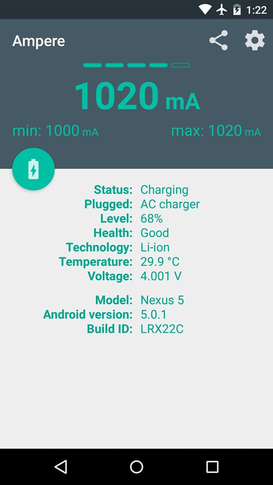 Після цього запустіть Ampere та запам’ятайте струм, який споживає мобільник від акумулятора. Потім приєднайте до гаджета зарядний пристрій, щоб побачити струм зарядки. Складіть ці два числа, і вони в сумі мають дорівнювати тому, що написано на корпусі зарядки.