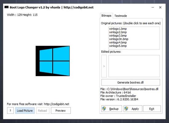 Після завантаження картинки до утиліти необхідно натиснути правою кнопкою у полі Edited Pictures, що дозволить програмі створити 6 файлів формату BMP для системних потреб. По завершенні цієї дії можна згенерувати системну бібліотеку bootres.dll, в якій знаходиться стартовий логотип системи. Її можна створити кнопкою Generate bootres.dll, а перед цим краще записати резервну копію клавішею Backup. Потім можна зберегти зміни, натиснувши Apply. Система видасть діалог з попередженням, в якому необхідно підтвердити зміни та перезавантажити комп’ютер.