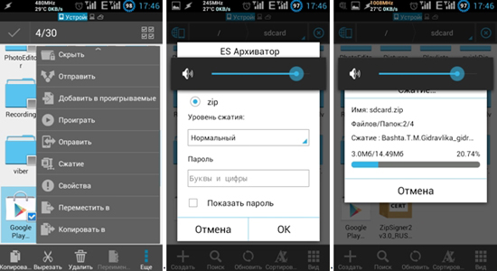 Користуватися архіватором на телефоні досить просто. Оберіть файли, які потрібно запакувати, та натисніть кнопку меню і після неї – клавішу «Стиснення». Зазначте параметри архівації та запустіть роботу