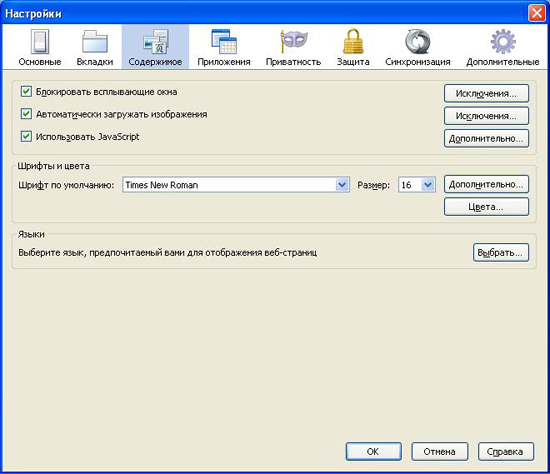 Зайдіть у налаштування веб-браузера та клікніть по вкладці «Вміст». Знайдіть у ній розділ «Шрифти та кольори» та увійдіть у нього, натиснувши кнопку «Додатково».