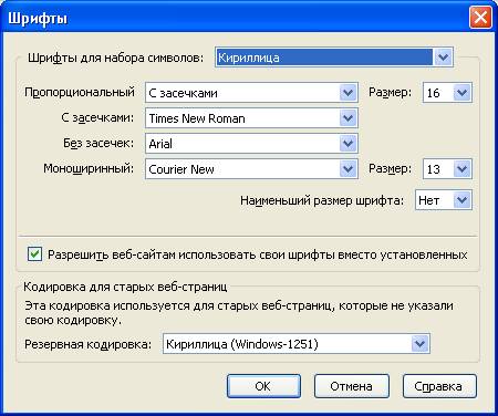 Зніміть позначку «Дозволити сайтам власні шрифти замість встановлених» та збережіть це налаштування. Після цього встановить кегль та шрифт за власним бажанням і натисніть OK.