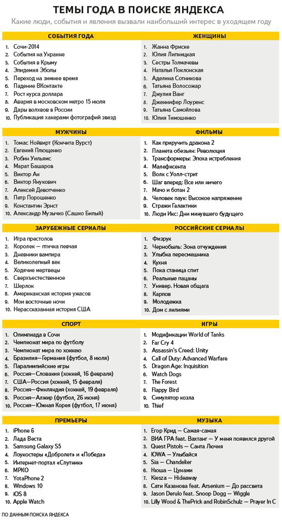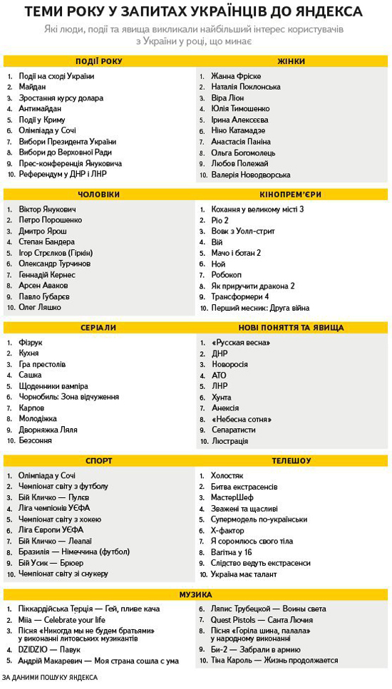 Компания "Яндекс" определила темы, которые больше всего интересовали украинцев в этом году. Итоги 2014 года подведены в девяти категориях: события года, женщины, мужчины, кинопремьеры, сериалы, новые понятия и явления, спорт, телешоу и музыка. Они опубликованы в корпоративном блоге компании.