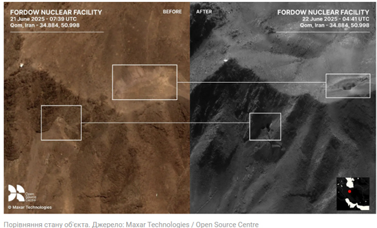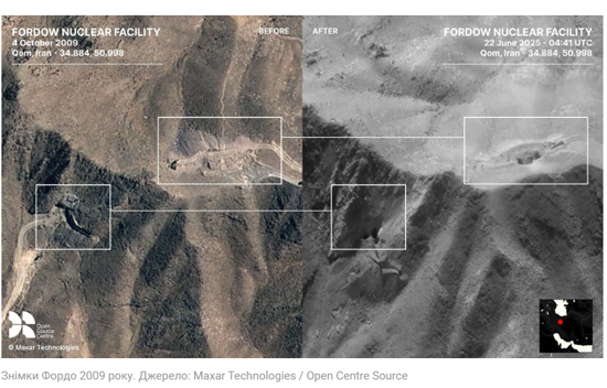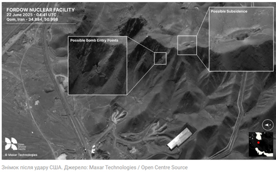 Через кілька годин після ударів Військово-повітряних сил США по території Ірану з'явилися супутникові знімки з наслідками атаки. Кадри підтверджують, що ціллю американських військ стали ядерні об'єкти у Фордо.