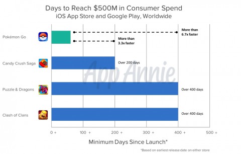 Примечательно, что Pokemon GO смогла заработать 500 миллионов долларов всего за два месяца, таким образом установив своеобразный рекорд. Другим крупным мобильным играм, например, таким как Candy Crush Saga и Puzzle & Dragons, для достижения подобных цифр понадобилось гораздо больше времени.