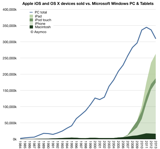 Самое время напомнить автору о недопустимости сравнения тёплого с мягким (iPod, iPhone, iPad — не чета Windows PC!), но не спешите. Добавьте лучше к 300 млн персоналок под Windows, проданных за 2013-й год, примерно 40 млн Windows Phone и Xbox — и... получите ту же самую картину: паритет неминуем! Если угодно, мы наблюдаем здесь в чистом виде результат пятнадцати лет противостояния двух компаний, двух цифровых платформ. Одна выдала минимум три инновационных продукта, смежных или пересекающихся с компьютерами (уже упомянутые плеер-телефон-планшетку, но если вы лично расположены к Apple, можете включить сюда ещё и ультрабук, например), вторая не только не выдала почти ничего новаторского своего, но, даже идя по стопам противника, добилась лишь очень скромных успехов.