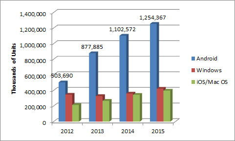 А это приводит нас ещё к одному участнику цифрового передела. В этой картине, конечно, есть третий игрок — и он взобрался на недосягаемую высоту и взирает оттуда с презрением на путающуюся под ногами мелочь. Это ОС Android — с миллиардом проданных устройств за прошедший год, с самой большой (уже!) базой используемых устройств под её управлением, стремительно увеличивающая отрыв от конкурентов. И Android, в отличие от несовместимых мобильных и стационарных операционок Apple и Microsoft, одна для всего спектра цифровых устройств, от телефонов до десктопов. Для неё глупого деления на «планшетки и персоналки» уже не существует.