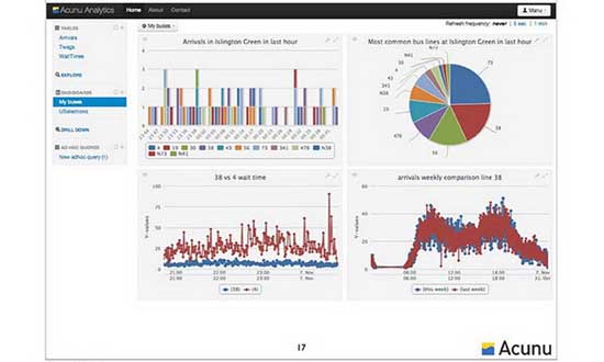 Компания Acunu Analytics предлагает доступ с малым временем задержки к аналитическим данным, которые используются в приложениях по контролю над инфраструктурой, Интернетом вещей, или работающих с веб-аналитикой, а также в других приложениях с высокой частотой поступления данных. Поскольку данные, поступающие с высокой скоростью, нужно анализировать незамедлительно, Acunu Analytics берет на себя обеспечение мощных операционных вычислительных средств.
