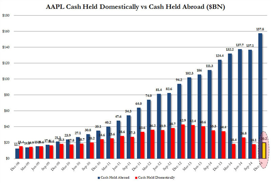На этом вопросе и остановимся подробнее. По последним данным, Apple имеет огромный запас кэша – $178 млрд. Почему на обратный выкуп своих акций нельзя направить деньги из этих средств? Ответ на этот вопрос очень прост, рассказывает Vestifinance. Если посмотреть на динамику прироста кэша за последний квартал, становится ясно, что большинство из этих денег было получено за пределами США. Объем наличности вырос со $137 млрд до $158 млрд, в основном за счет всплеска продаж iPhone в Китае.