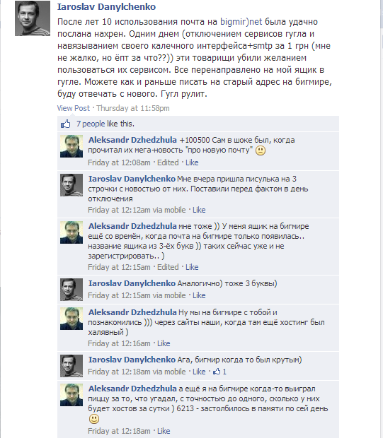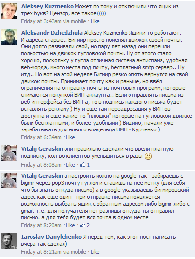 Переписка пользователей на официальной странице bigmir.net в Facebook.