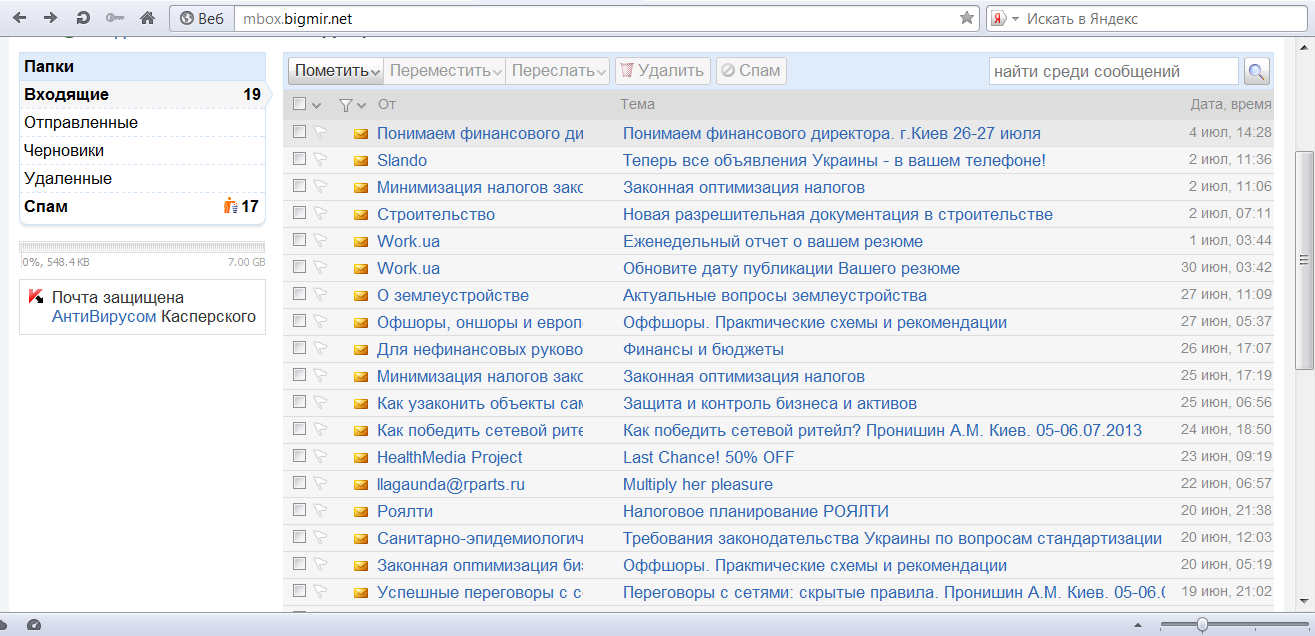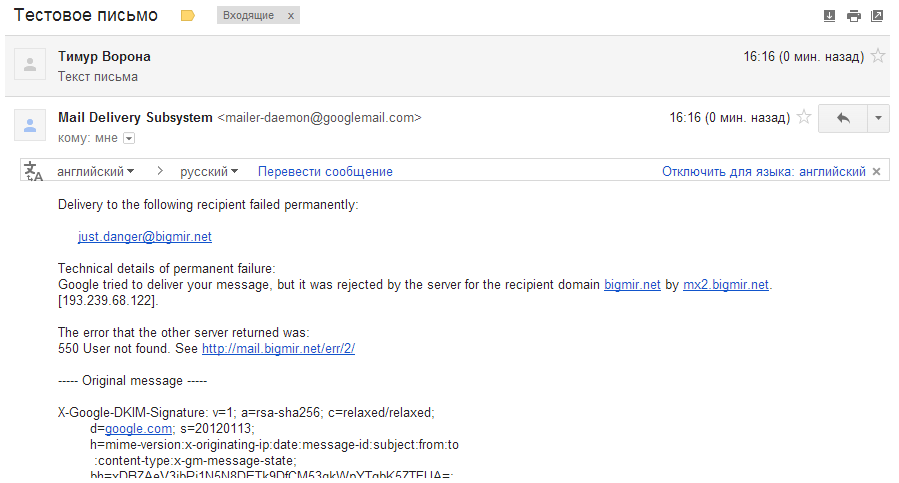 Мы создали ящик на «Бигмире» и проверили как доставляется почта. И действительно, несколько писем подряд ушло в никуда: