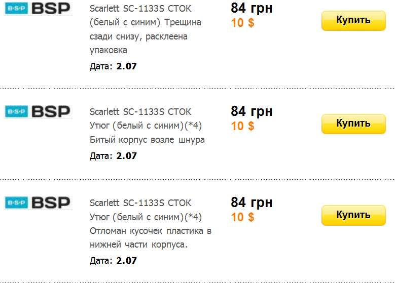 Средняя цена утюга Scarlett SC-1133S – 163 грн. Самое дешевое предложение - 84 грн. Это явно какой-то подвох. Ах да, товар "бракован":