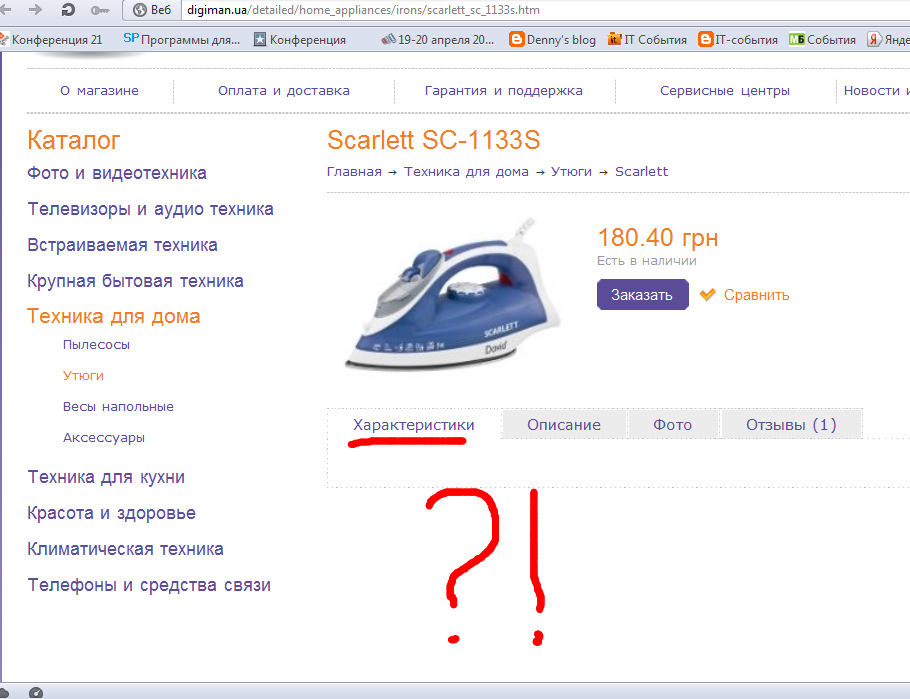Перехожу по следующей ссылке, предусмотрительно указав, что нахожусь в городе Киеве. Отсутствует ЛЮБАЯ информация о «моём» утюге, кроме цены. Кликаю на раздел «доставка товара» (любопытства ради). Доставка по Харькову 100 грн. Киева в списке городов на сайте магазина не значится. Лучшее предложение? Да нет, опять запутали.