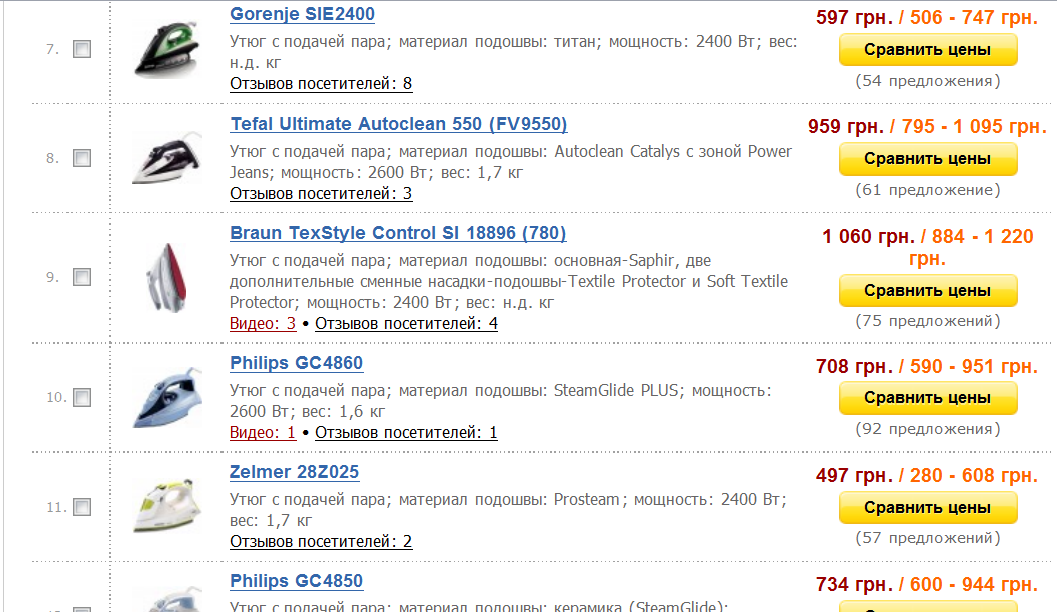 Но вернёмся к прайс-агрегатору. Он на ствоей странице имеет информацию, которая меня окончательно запутала. Подошвы у утюга Scarlett SC-1133S предлагаются либо керамические, либо из нержавеющей стали, либо «с керамическим напылением» при практически «ровном» разбросе в 50 грн. (и это одна и та же модель!). Паровой удар варьируется от 30 г/мин. до 90 г/мин. Довольно странный разброс. Особенно, если учесть, что глубокие складки разглаживаются только при 60г/мин.