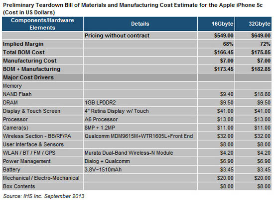 Аналитики iSuppli просчитали стоимость производства iPhone 5c, продаваемого за $549 ($173 или 68,5% прибыли) и сравнили с iPhone 5s за $649 ($199 или 69,3% прибыли).