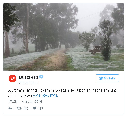 В австралийском городке Яннар девушка по имени Лесли Шмидт (Leslie Schmidt), играя в Pokemon GO вместе со своим молодым человеком, столкнулась с необычным явлением — полностью покрытым паутиной парком. Об этом сообщает BuzzFeed.