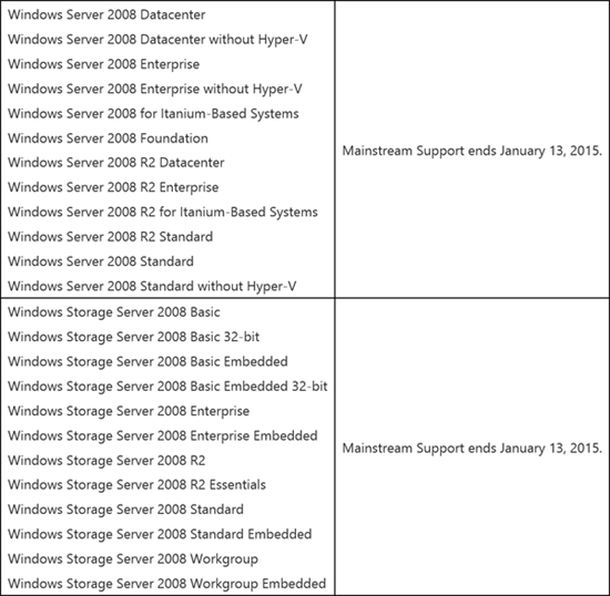 Список серверных продуктов Windows Server, для которых истекает период основной поддержки, представлен ниже в таблице.