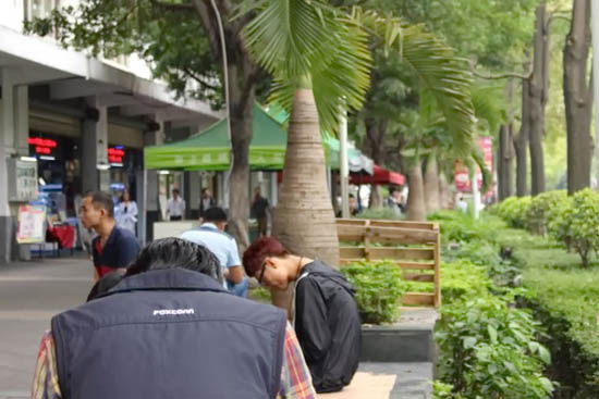 Интернет-кафе находится на главной улице, засаженной деревьями, рядом с ресторанчиками быстрого питания, банками и магазинами. В целом местность напоминает американские корпоративные городки прошлого, в которых работодатель обеспечивал своих сотрудников всем необходимым — товарами, услугами, жильем, часто по довольно высокой цене. Как сообщил журналистам мистер Ву, магазины и общежития на территории производства Foxconn — это отдельные частные предприятия. Сами рабочие Foxconn могут жить и вне кампуса.