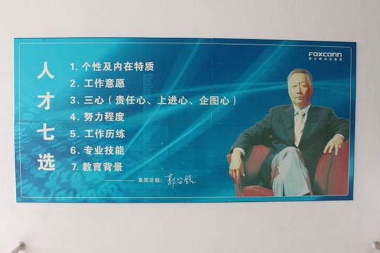 Гвоздем программы в рамках экскурсии по Foxconn стало посещение Университета Foxconn, где можно увидеть огромное изображение самого президента компании Терри Гу. На постере изложены семь черт, нужных для успеха, среди которых стремление к труду, три основных элемента характера (ответственность, мотивация, амбиции) и рабочая этика. По словам Луиса Ву, с 2007 года профессиональный курс в этом университете прошли 1,5 млн студентов.