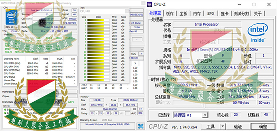 Но вернёмся к таинственной покупке. Китайские энтузиасты уже опубликовали полученные результаты. CPU-Z ещё не умеет корректно определять его модель и напряжение питания, но видно, что перед нами 20-ядерный процессор с корректно функционирующей технологией Hyper-Threading. Его рабочая частота составляет 2,1 ГГц, множитель ×21, а объём кеша L3 составляет внушительные 50 мегабайт, по 2,5 Мбайт на ядро. Частота в турборежиме предположительно может достигать 3,5 ГГц, пакет HWiNFO64 демонстрирует работу всех ядер на частоте 2,6 ГГц. Теплопакет неизвестен, но ориентировочно находится в пределах 130-140 ватт. В сравнении с Xeon E5-2698 v3 (16 ядер, 40 Мбайт кеша L3, турборежим до 3,6 ГГц) это шаг вперёд — в основном, за счёт перехода на 14-нанометровый техпроцесс.