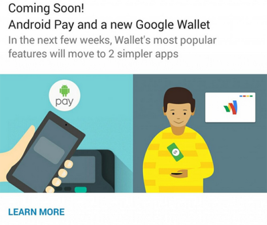 Как сообщает phonearena, до запуска Anroid Pay остаётся всего несколько недель. Это даёт понять новый тизер, появляющийся при запуске приложения Google Wallet. Всплывающее окно сообщает, что приложение в ближайшее время будет переименовано в Android Pay, а в Google Play появится новое приложение для Google Wallet.