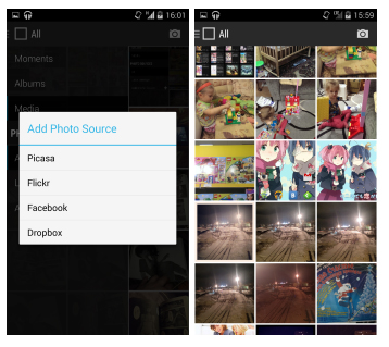 Сама программа предельно простая, хотя и спроектирована по современным канонам построения интерфейса Android-приложений. Слева имеется выдвигающаяся «свайпом» панель, в которой можно переключиться между несколькими видами фильтрации и группировки картинок из памяти телефона, а также добавить сетевой источник (Picasa, Flickr, Facebook и Dropbox) и посмотреть хранимое на нем. Из интересного стоит отметить красивое оформление папок в режиме «Albums».