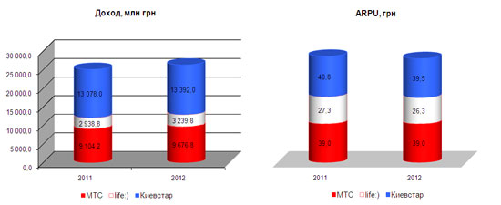 Не удивительно, что в таких условиях доходы операторов в сравнении с 2011 годом изменились на единицы процентов, а колебания их рыночных долей по доходам мобильного бизнеса вообще можно списать на статистическую погрешность. Также на единицы процентов уменьшается замершая на уровне около 40 грн средняя выручка с абонента (ARPU) — показатель, чаще других используемый при оценке прибыльности рынка и его инвестиционной привлекательности.