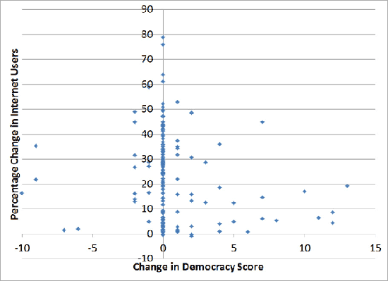 По горизонтальной оси на графике отложено изменение оценки по уровню демократичности в стране за 2002-2011 годы (рейтинг PolityIV). По вертикальной оси показано увеличение количества пользователей интернета за эти годы, в процентах.