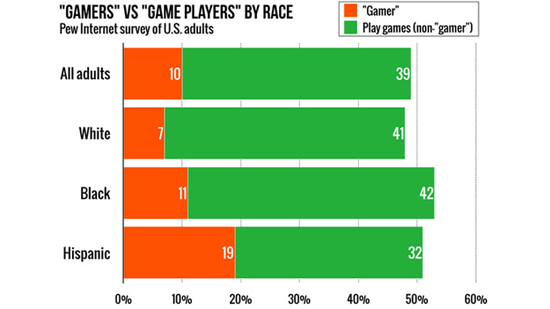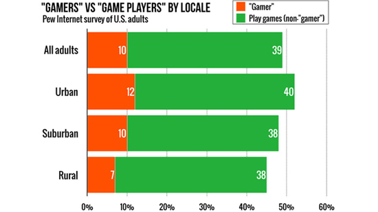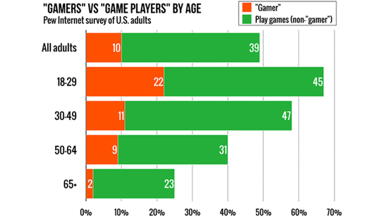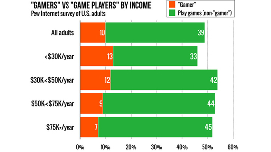 Новое исследование, проведенное американским центром Pew Research Center, выявило необычную закономерность — люди, называющие себя «геймерами», как правило беднее тех, кто играет в видеоигры, но не относит себя к «геймерам». В результате опроса выяснилось, что 49% населения США играет в видеоигры, и только 10% называет себя «геймерами».