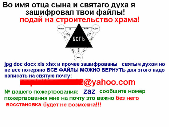 Специалисты из «Лаборатории Касперского» обнаружили очередного зловреда под названием Trojan-Dropper.Win32.Dapato.dggc. Вирус выдает себя за «святаго духа» и в почти ультимативной форме требует пожертвовать на строительство храма. Безграмотное сообщение гласит: «jpg doc docx xls xlsx и прочее зашифрованы святым духом но не все потеряно ВСЕ ФАЙЛЫ МОЖНО ВЕРНУТЬ для этого надо написать на святую почту».