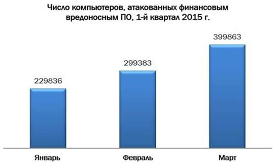 Число пользователей, столкнувшихся с попытками кражи денег с банковских онлайн-счетов, за первые три месяца этого года увеличилось на 64%. Такие данные озвучили эксперты KasperskyLab на основе анализа киберугроз в первом квартале 2015 года, сообщает IT Expert.