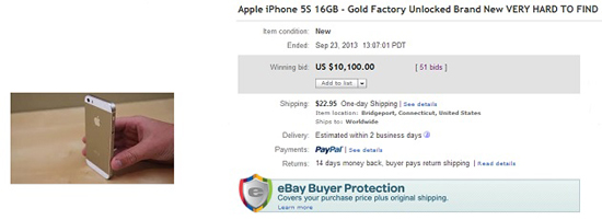В понедельник вечером онлайн-аукцион eBay закончил принимать ставки на разлоченный iPhone 5s цвета «шампань». В течение 24 часов стоимость смартфона росла постепенно, пока не остановилась на сумме $2500 примерно за два часа до окончания торгов. Однако в последний минуту какой-то фанат продукции Apple поставил $10 тысяч на этот лот. Ставка была перебита другим пользователем, который добавил к этой сумме еще сотню долларов.