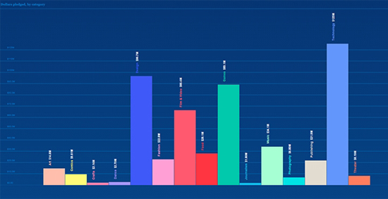 Что касается распределения пожертвований, то в 2014 году «Игры», два предыдущих года подряд лидировавшие по этому показателю, оказались только на третьем месте ($89,1 млн). Рекордсменом по сумме привлечённых средств стала категория «Технологии» ($125 млн), а второе место отошло «Дизайну» ($96,7 млн). «Фильмы и видео», в 2013 году занимавшая вторую строчку, оказалась на четвёртой ($66,4 млн). Меньше всего вкладов предсказуемо привлекли «Журналистика» ($1,9 млн) и «Ремесло» ($2,14 млн).