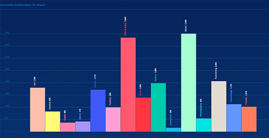 Наибольшее количество успешно профинансированных проектов пришлось на категорию «Музыка» (4 009). Вторую строчку занимают «Фильмы и видео» (3 845), а на третьей разместились «Издательские проекты» (2 064), немного опередившие «Игры». Пятое место отошло «Искусству» (1 796), которому незначительно уступил «Дизайн» (1 715). На седьмую позицию забралась «Еда» (1 393), восьмой стала категория «Технологии» (1 124), а девятой — «Театр» (1 019). Не смогла преодолеть порог в тысячу проектов «Мода» — в этом секторе профинансировали только 996 кампаний. Наименьшими успехами выделились «Журналистика» (158) и «Ремесло» (369), но этому есть объяснение — данные категории были добавлены в июне 2014 года.