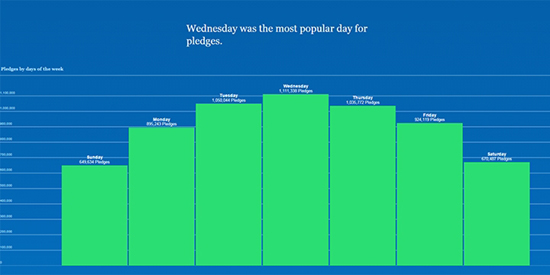 В среднем больше всего средств перечислялось в среду, а в субботу и воскресенье активность вкладчиков сильно снижалась. Одним из самых благоприятных дней для Kickstarter стало 12 марта, когда всего за час (с 11:00 до 12:00) пользователи пожертвовали почти $400 тыс. — примерно $110 в секунду. Именно в этот день Нил Янг (Neil Young) запустил кампанию по сбору средств на портативный цифровой музыкальный проигрыватель Pono.