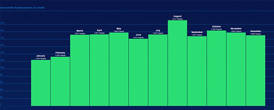 Всего в прошлом году на Kickstarter были успешно профинансированы 22 252 проекта во всех категориях — это лучший результат за всю историю сервиса. Пик активности пришёлся на август (2 311 проектов), а наименьшим количеством получивших нужную сумму кампаний отличились январь и февраль (1 242 и 1 326 проектов соответственно). В прошлом году пользователи пожертвовали на Kickstarter $529 млн — в среднем это больше $1 тыс. в минуту.