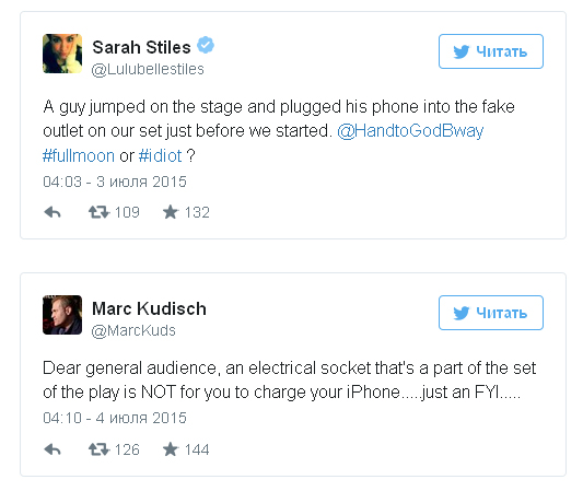 Инцидент произошёл незадолго до начала бродвейской постановки Hand to God («Рука Бога»). Один из зрителей в зале обнаружил, что его айфон почти сел, и забрался на сцену, чтобы подпитать смартфон. Однако примеченная им розетка оказалась такой же ненастоящей, как и остальные декорации.