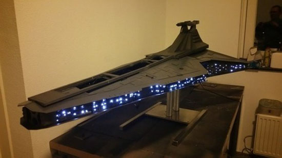 Внутренняя начинка системного блока была особым образом установлена в корпус, чтобы имитировать работу двигателей звездного крейсера. Вентиляторы и части освещения придают космическому кораблю пугающую реалистичность. Рамка корпус сделана из листов алюминия, а остальные мелкие детали были распечатаны на 3D принтере.