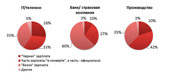 По доле черных выплат IT и телеком отстает сразу от шести сфер — 26% сотрудников получают зарплату «в конвертах», при этом среди сотрудников банков таких только 10%, в агробизнесе 13%, в медицине 14%, на производстве 20%, а в консалтинге и логистике 23%. Эти данные были получены в результате опроса 3739 респондентов в сентябре-октябре 2013 г.
