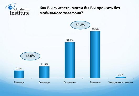Большинство молодых украинцев (80,2%) считают, что не смогли бы прожить без мобильного телефона. Из них 45,5% выбрали ответ «точно нет», а 34,7% — «скорее нет». При этом 18,5% опрошенных полагают, что могли бы прожить без мобильного телефона. Из них 11,3% предпочли ответ «скорее да», 7,2% — «точно да». Затруднились ответить на этот вопрос 1,3% респондентов.