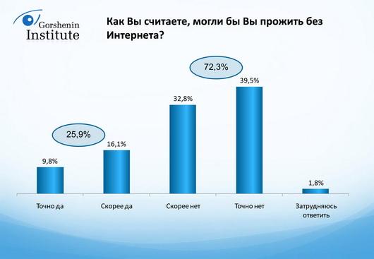 Большинство украинской молодежи (72,3%) не представляют своей жизни без интернета. Из них 39,5% предпочли ответ «точно нет», 32,8% — «скорее нет» на этот вопрос. При этом каждый четвертый опрошенный (25,9%) уверяет, что мог бы обойтись без интернета. Из них ответ «скорее да» выбрали 16,1%, «точно да» — 9,8%. Затруднились с ответом на вопрос – 1,8% респондентов.