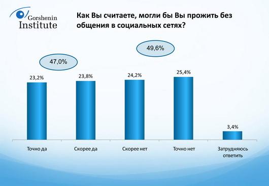 Каждый второй представитель украинской молодежи (49,6%) утверждает, что не мог бы прожить без общения в социальных сетях. Из них 25,4% выбрали ответ «точно нет», 24,2% — «скорее нет». При этом 47,0% опрошенных считают, что могли бы обойтись без такого общения. Из них 23,8% выбрали ответ «скорее да», а 23,2% — «точно да». Затруднились с ответом на этот вопрос 3,4% респондентов.