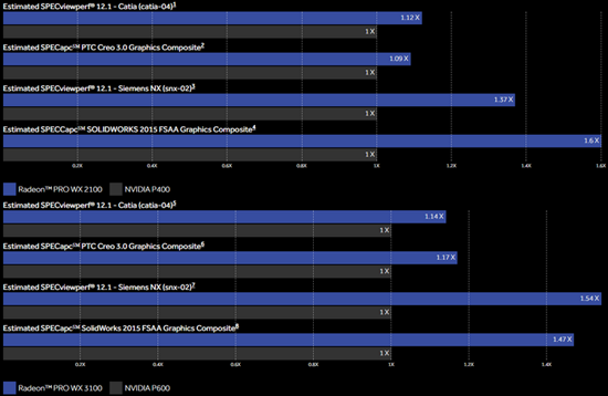Судя по результатам тестов, опубликованным AMD, новинки более чем успешно конкурируют с аналогичным им по классу решениями NVIDIA. Для младшей модели это Quadro P400, для более мощной WX 3100 — Quadro P600. В некоторых случаях выигрыш достигает полуторакратных и более значений. Карты отлично вписываются в конфигурацию компактной рабочей станции, поскольку выполнены низкопрофильными. Любопытно, что они используют шину PCI Express x8, хотя механически разъём выполнен в соответствии с габаритами слота x16. Каждая из новинок оснащена тремя разъёмами DisplayPort: одним классическим и двумя mini-DP. Гарантируется поддержка режимов HBR/HDR, возможно одновременное использование трёх мониторов формата 4К с частотой обновления 60 Гц или одного дисплея формата 5К с частотой 30 Гц.