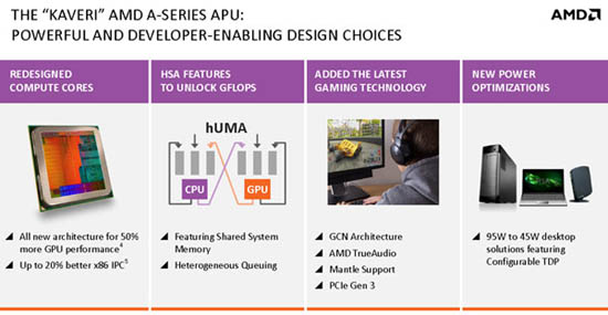 Важным нововведением является совместный доступ CPU и GPU к системной памяти и наличие гетерогенной очереди доступа. Встроенные GPU на архитектуре GCN поддерживают технологии AMD TrueAudio и PCIe Gen 3, а также API Mantle. Новые APU характеризуются конфигурируемым TDP от 45 до 95 Вт.
