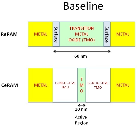 TMO имеют неполные атомные оболочки 3d или 4d, которые проходят через переход металл-изолятор. В случае с NiO достаточно напряжения 0,6 В для записи изолированного состояния и 1,2 В для записи проводящего состояния. При этом не требуются никакие термодинамические фазовые переходы, как в традиционной ReRAM. Скорость переключения ячеек CeRAM-памяти может достигать десятки фемтосекунд, а напряжение питания при чтении составляет всего около 0,1-0,2 В. Состояние памяти остаётся стабильным даже при нагреве вплоть до 400 градусов Цельсия.